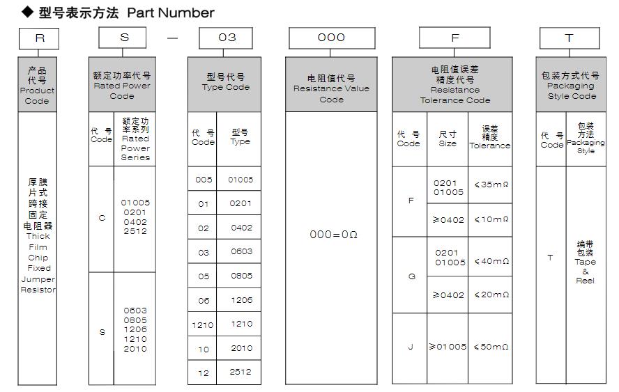 風(fēng)華高科厚膜片式跨接固定接電阻器型號(hào)表示方法: