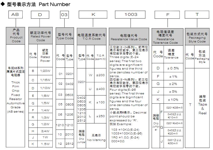 風(fēng)華車規(guī)AB系列厚膜片式固定電阻器型號命名規(guī)則: