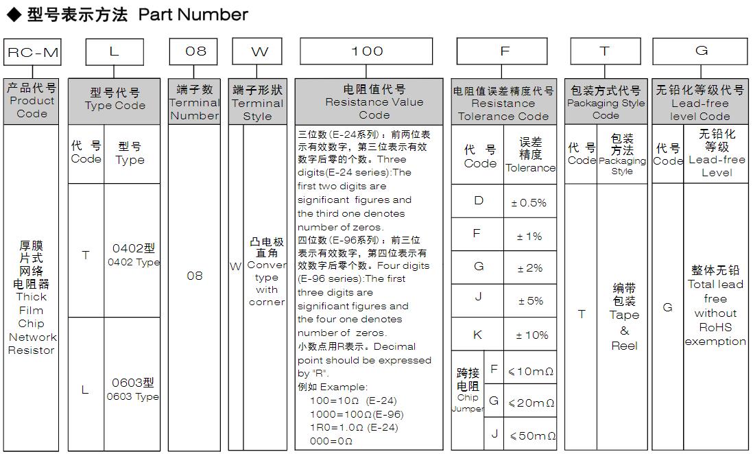 風(fēng)華高科無(wú)鉛厚膜片式網(wǎng)絡(luò)電阻器型號(hào)命名規(guī)則: