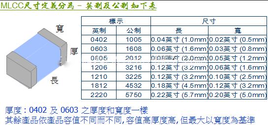 依照MLCC產(chǎn)品【尺寸】的大小分類 : 0402 ; 0603 ; 0805 ; 1206 等。