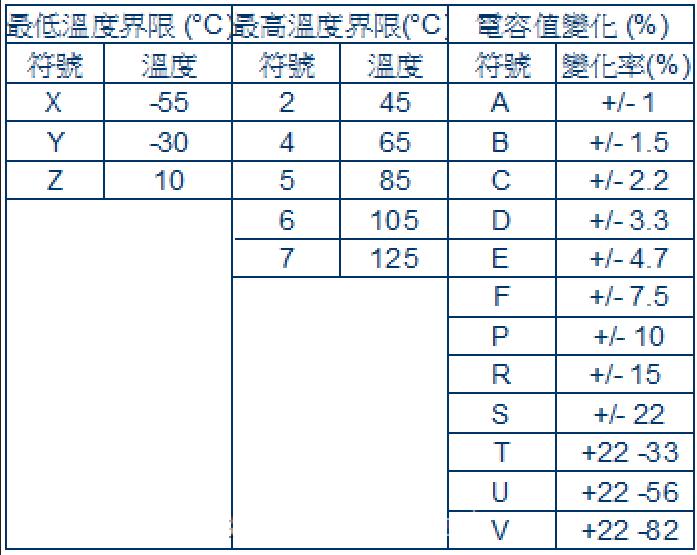 Y5V : 表示-30°C(Y) ~到 85°C(5) 其容量變化(以25°C為基準(zhǔn))必須在+22~82%(V)以內(nèi)。
