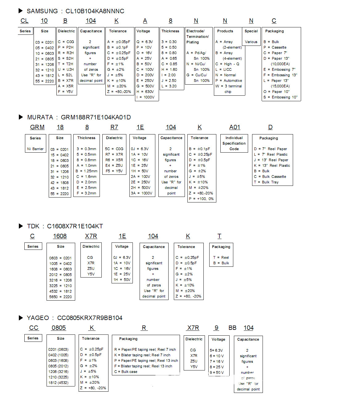 貼片電容的命名所包含的參數(shù)有貼片電容的尺寸、貼片電容用的材質(zhì)、要求達(dá)到的精度、要求的電壓、要求的容量、端頭的要求以及包裝的要求。一般訂購貼片電容需提供的參數(shù)要有尺寸的大小、要求的精度、電壓的要求、容量值、以及要求的品牌。生產(chǎn)廠家都會(huì)在料盤上貼上這些參數(shù),每顆物料一般都有型號(hào),可以通過型號(hào)就能知道里面的貼片電容參數(shù),每個(gè)廠商的貼片電容命名都不一樣,今天超翔小編就來講解下各大廠商貼片電容型號(hào)命名規(guī)則。