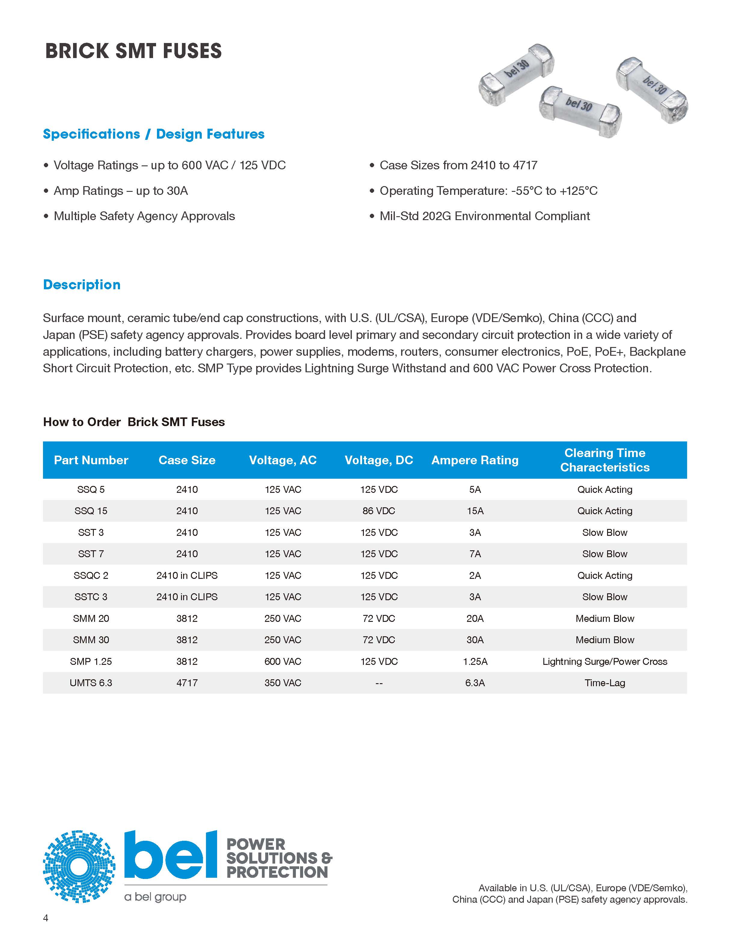 表面貼裝,陶瓷管/端蓋建筑,與美國(UL / CSA),歐洲(VDE / SEMKO),中國(CCC)和日本(PSE)安全機構批準。 提供各種各樣的板級初級和二級電路保護應用,包括電池充電器,電源,調制解調器,路由器,消費電子,PoE,PoE +,背板短路保護等。SMP型提供閃電浪涌耐受和600 VAC電力交叉保護