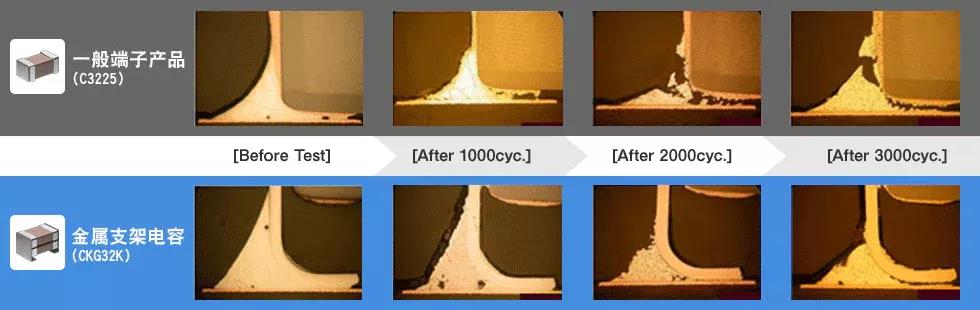 TDK的金屬支架電容對于焊錫裂紋擁有極高的抑制效果。圖5為3000次循環熱沖擊的截面比較圖,從圖中可以看出,一般端子產品相比金屬支架電容,其焊錫更易劣化。特別在2000次循環以上,其差異更加明顯。