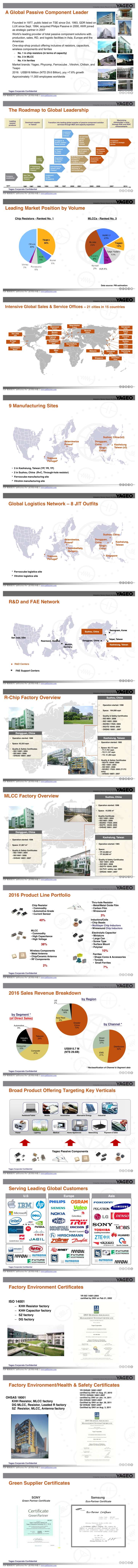 國巨現(xiàn)今為全球第一大芯片電阻器 (R-chip) 制造商、全球第三大積層陶瓷電容 (MLCC) 供貨商,在磁性材料 (ferrits) 領(lǐng)域則名列全球第三。國巨目前在全球18個(gè)國家有27個(gè)行銷/服務(wù)據(jù)點(diǎn)、8座生產(chǎn)基地、5座 JIT即時(shí)發(fā)貨中心,及3個(gè)研發(fā)中心。位于歐洲的飛磁(Ferroxcube) 和 Vitrohm 也隸屬于國巨集團(tuán),分別以生產(chǎn)磁性材料和傳統(tǒng)電阻為主。