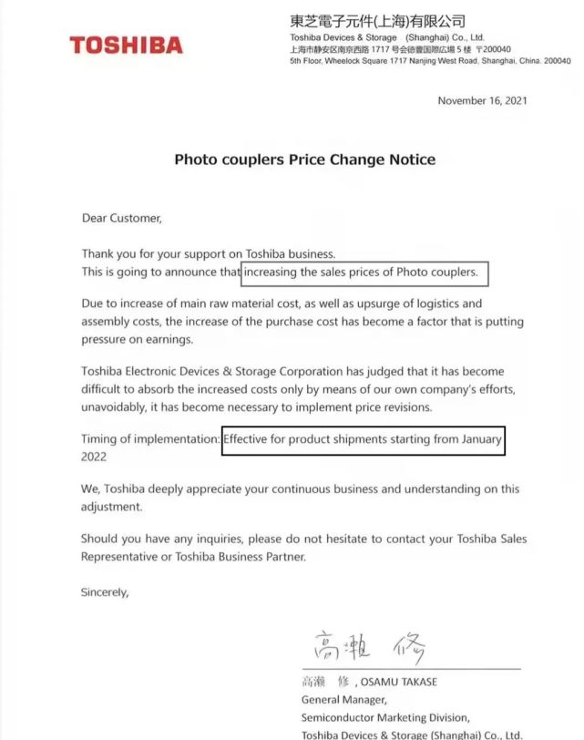 重磅!東芝發漲價函!2022年1月調漲!